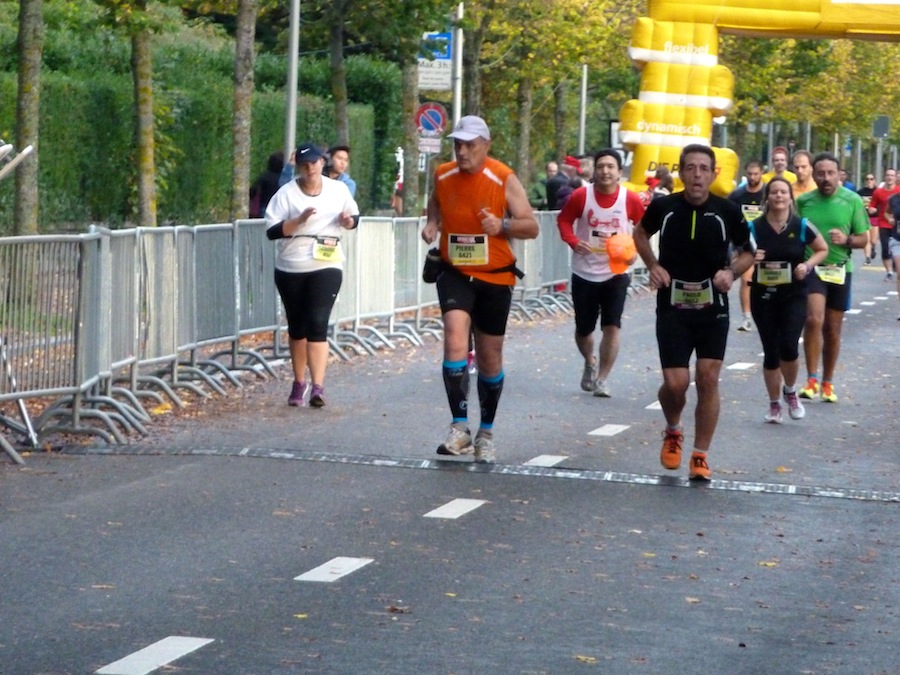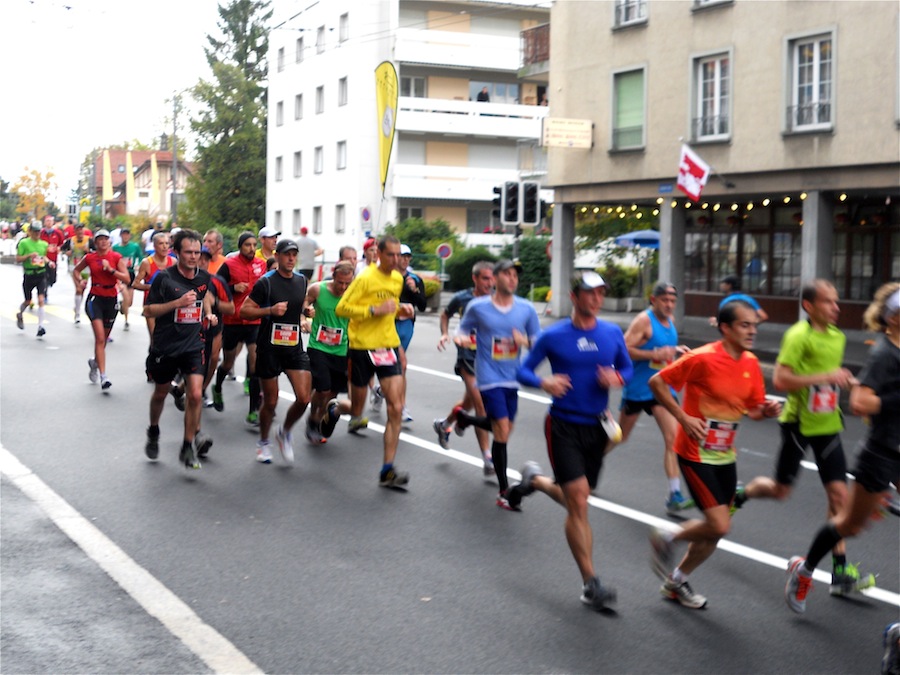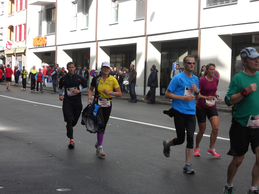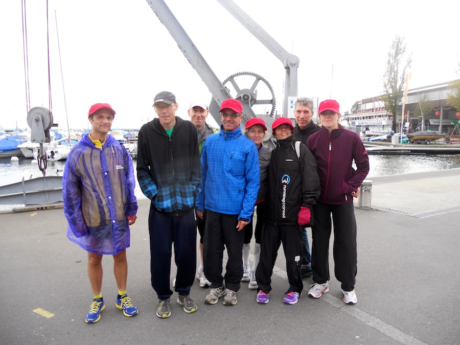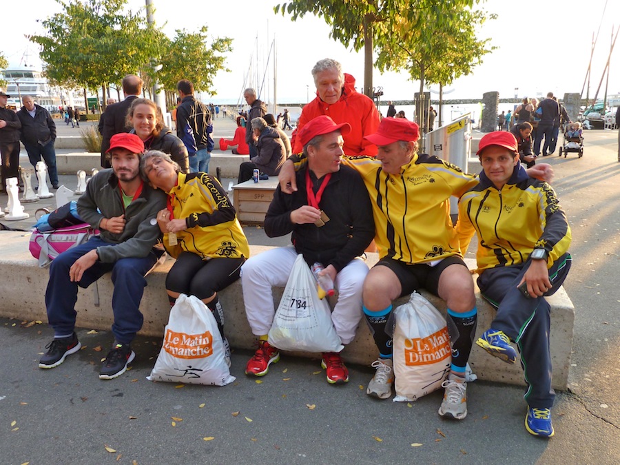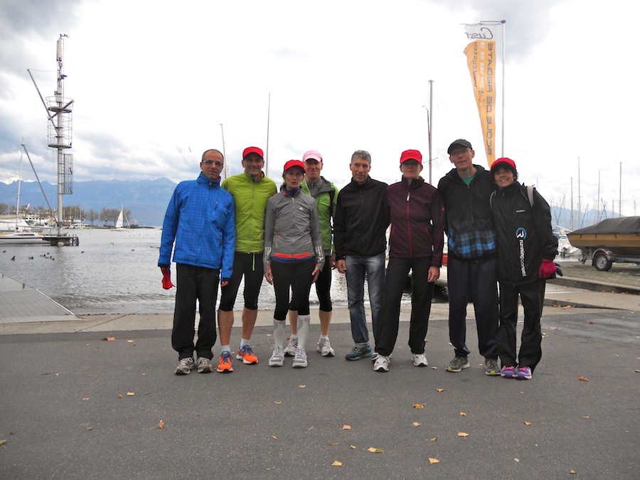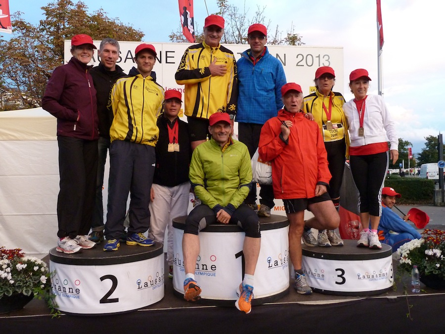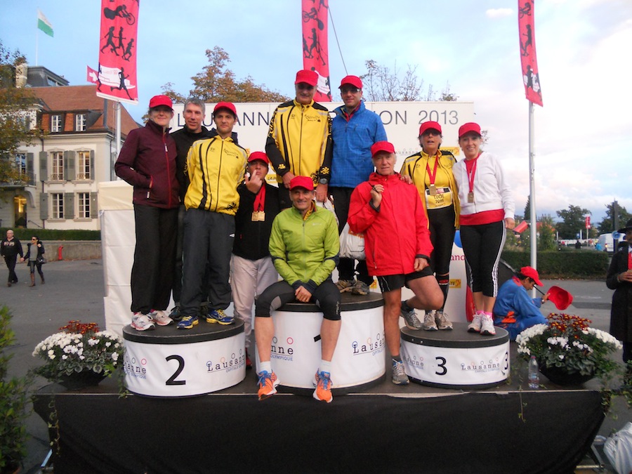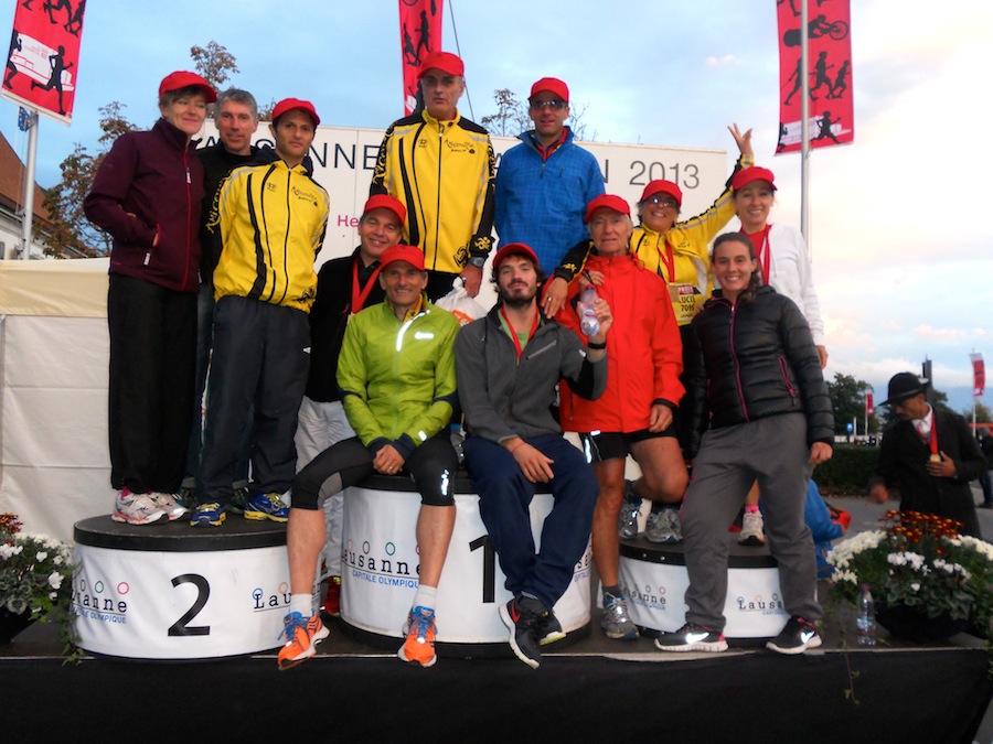 La météo avant le départ n’était pas propice à sortir l’appareil photo… Mais heureusement Stephan et Claude (merci!) étaient là pour immortaliser quelques instants de ce marathon et du semi de Lausanne 2013 avec une belle photo de groupe sur le podium avec les casquettes finishers rouges ! Trop beaux non ?