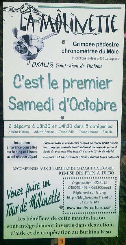La Molinette, c’est une grimpée pédestre chronométrée du Môle qui se déroule le premier samedi d’Octobre (05/10/2019) et organisée par l’association humanitaire OXALIS. Ce qui représente 700 m de dénivelé positif pour une distance de 4,5 km environ sur un itinéraire tracé obligatoire jusqu’à mi-course (Petit Môle) avec passage contrôlé puis le reste du parcours est libre jusqu’à l’arrivée (croix du grand Môle). Parmi les 180 participants, Céline en 49:46 et Irène en 50:19 étaient de la partie, bravos à elles !!! Les résultats