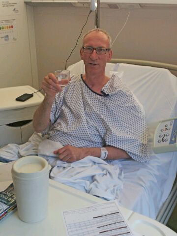 Ci joint une photo de notre président en mode repos longue durée et obligé de boire de l’eau… Son opération (coté gauche) s’est bien passée. Y a plus qu’à attendre que les soudures tiennent pour reposer le pied par terre.